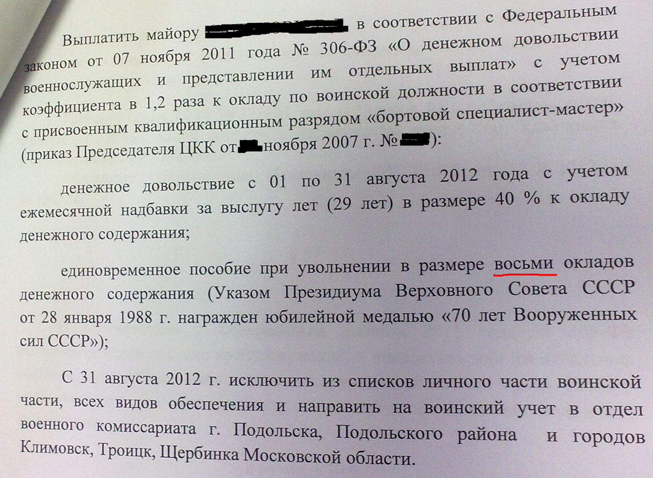 По поводу медали «70 лет Вооруженных Сил СССР». В мае месяце написал рапорт на имя командира части на выплату дополнительного оклада за медаль 70 лет. Командир пропустил этот рапорт через юриста. Юрист дал "добро", всё законно. Командир рапорт подписал. Соответственно кадры включили в проект приказа восьмой оклад. ГУК, как видите с этим согласился . Никакого суда .Теперь жду, когда состоится выплата выходного.Всем удачи и никогда НЕ СДАВАТЬСЯ и бороться за свои права.