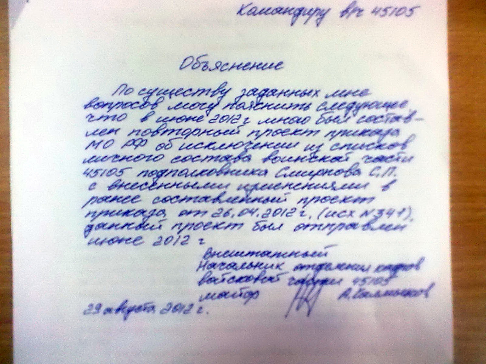 14 июня 2012 года Министром обороны РФ издан приказ № 1459, согласно которому Смирнов С.П. с 1 июля 2012 года исключен из списков личного состава войсковой части №.