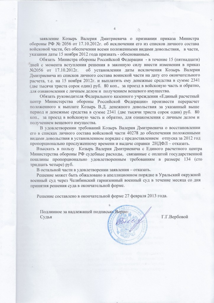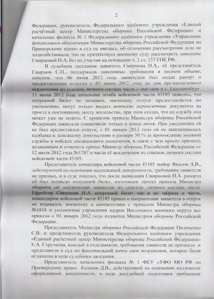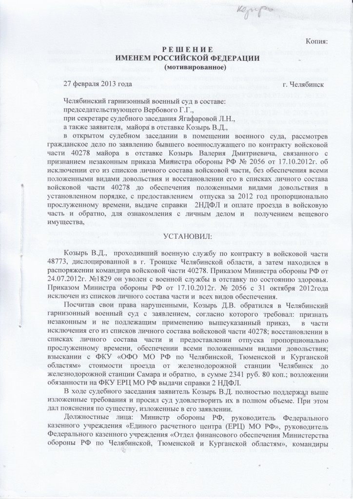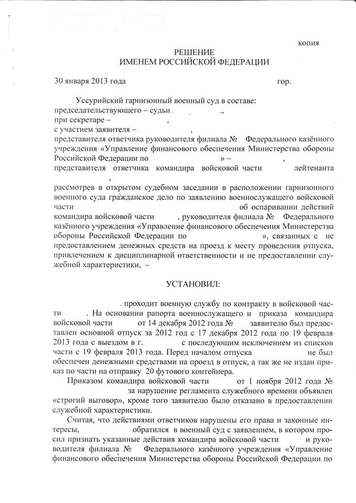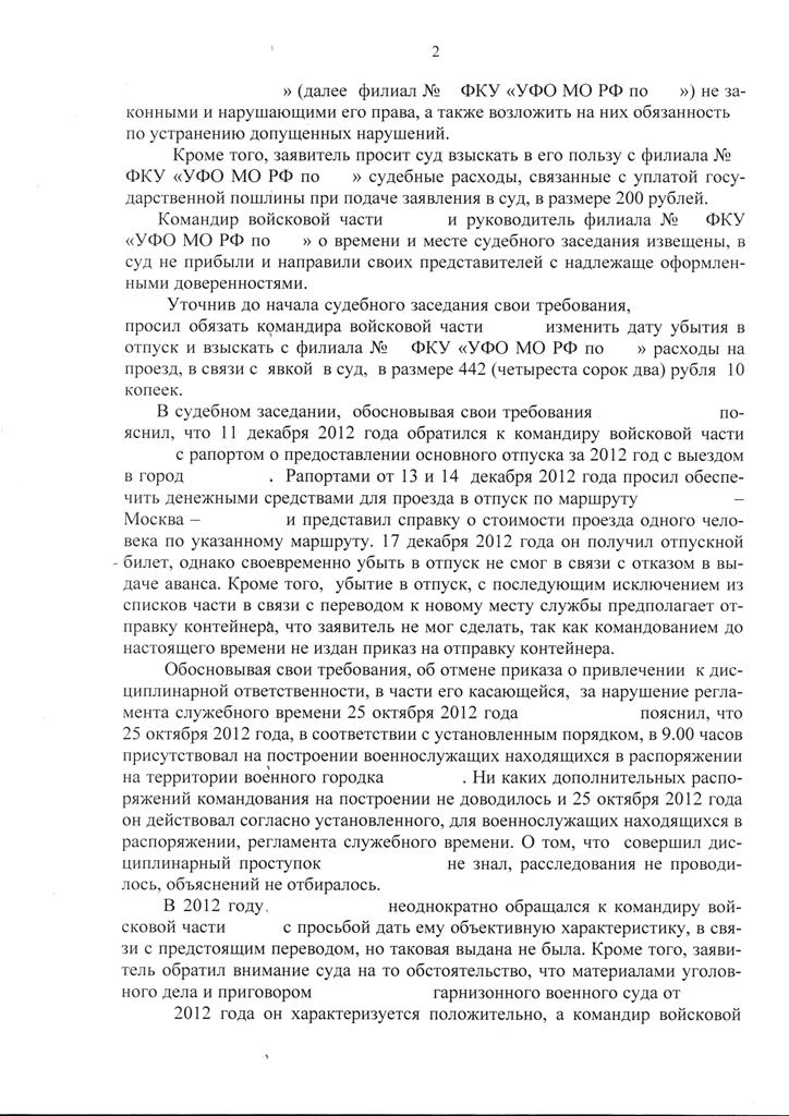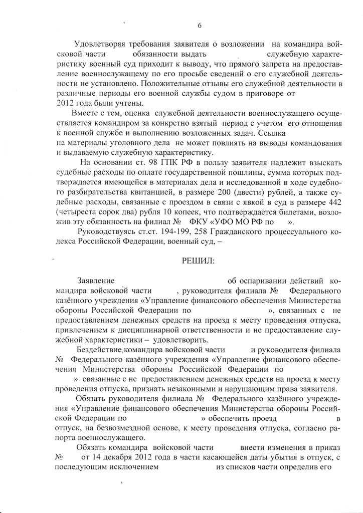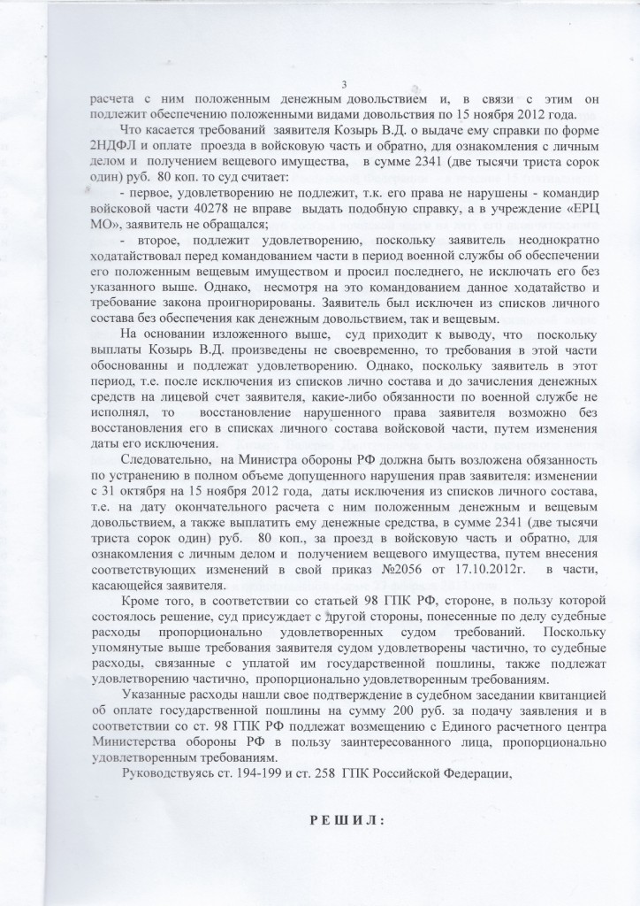 -обязать командира войсковой части № и Министра обороны Российской Федерации восстановить его в списках личного состава войсковой части №, предоставить основной отпуск за 2012 год и обеспечить положенными видами довольствия.