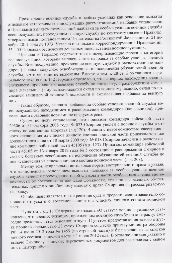 При таких обстоятельствах, учитывая, что согласно положениям п. 4 ст.3 Федерального закона «О статусе военнослужащих», реализация мер правовой и социальной защиты военнослужащих является обязанностью командиров (начальников), а согласно требованиям приказа МО РФ № 1818 от 5 октября 2011 года, проекты приказов по личному составу представляются на подпись Министру обороны Российской Федерации, суд приходит к выводу о незаконности действий командира войсковой части № и Министра обороны Российской Федерации, связанных с невыплатой Смирнову С.П. в период с 1 января по 30 июня 2012 года ежемесячной надбавки за особые условия военной службы военнослужащим, проходящим военную службу в соединениях (воинских частях, подразделениях) специального (особого) назначения, и необходимости удовлетворения требований заявителя в данной части.