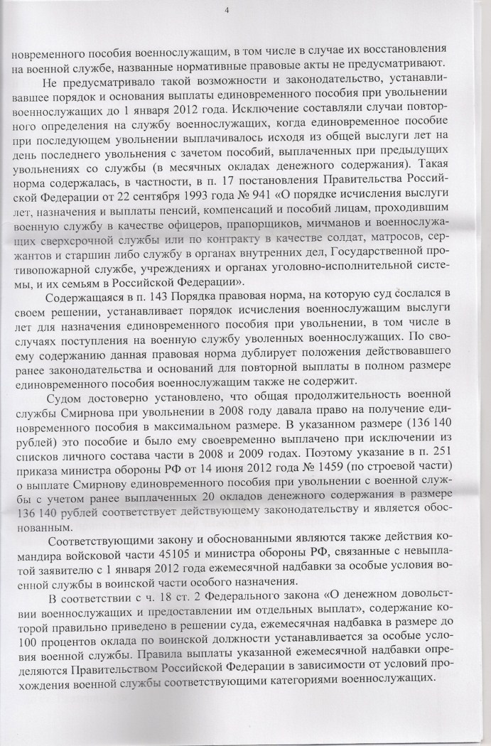 Вместе с тем, как следует из выписки из приказа МО РФ № 1459 от 14 июня 2012 года, размер единовременного пособия при увольнении Смирнову С.П., общая продолжительность военной службы которого в Вооруженных Силах РФ по состоянию на 1 июля 2012 года составляет более 32 лет, указан без увеличения его размера на один оклад денежного содержания как военнослужащему, проходящему военную службу по контракту, удостоенному в период прохождения военной службы государственной награды СССР.