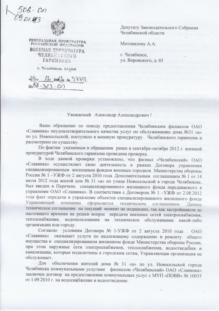 Вчера получен ответ от депутата Мотовилова:#1097 » 08 окт 2012 Итак, обсудили проблемы. Завтра подаем обращение к Депутату Законодательного Собрания Челябинской области Мотовилову Александру Александровичу