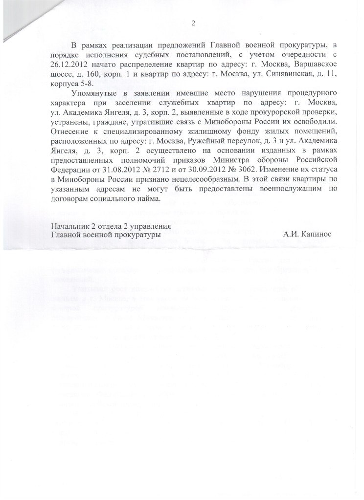 "По поручению заместителя генерального прокурора Российской Федерации - Главного военного прокурора государственного советника юстиции 1 класса Фридинского С.Н. по коллективной жалобе от 18.09.2012 о нарушениях законодательства при распределении жилых помещений, расположенных по адресу: г. Москва, ул. Академика Янгеля, д. 3, корп. 2, проведена проверка.