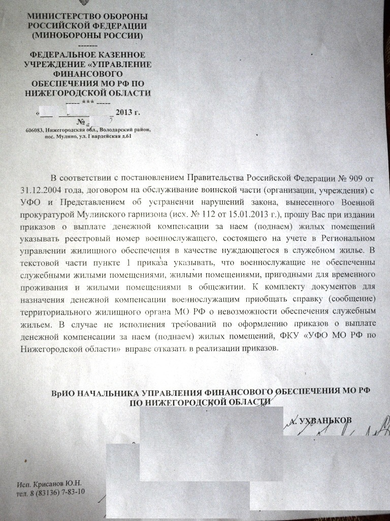 Указания от 01.10.12г. директора Департамента финансового планирования Министерства обороны Российской Федерации по выплате денежной компенсащии за не полученное вещевое имущество.