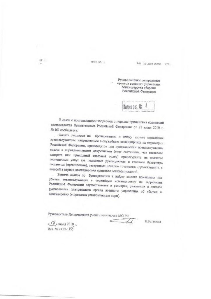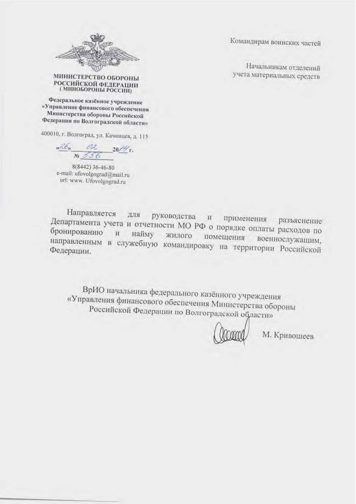Разъяснение Департамента учета и отчетности МО РФ о порядке оплаты расходов по бронированию и найму жилого помещения военнослужащим, направленным в служебную командировку на территории Российской Федерации.