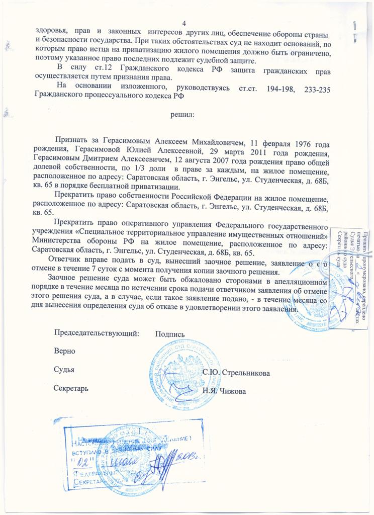 Сегодня в почтовом ящике обнаружил письмо из районного суда, в нем оказались решения суда, но вчем загвозка в решении не правильно указана общая площадь ЖП должна быть 56,7 а в решении 66,4, чем суд руководствовал не знаю, видимо с потолка писали, хотя в заявлении была правильно указана площадь и в предоставленных документах с БТИ и Регпалаты. И ещё в решении указано, что я и моя семья на заседание не явилась, на предварительном заслушивании мне сказала сама судья, что на заседании могу я один прибыть, что я и сделал - прибыл в назначенный срок, просидел в коридоре 1,5 часа, но так как у судьи не было времени, то приняв недостающие документы у меня секретарь - пояснила, либо будим ждать после обеда, либо без заседания. На что мне пришлось согласиться - без заседания.