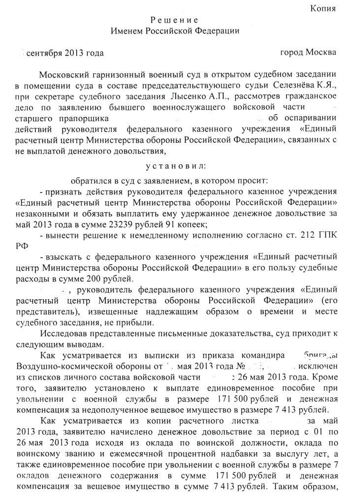 Решение Московского ГВС по незаконному удержанию из ДД ЕРЦ