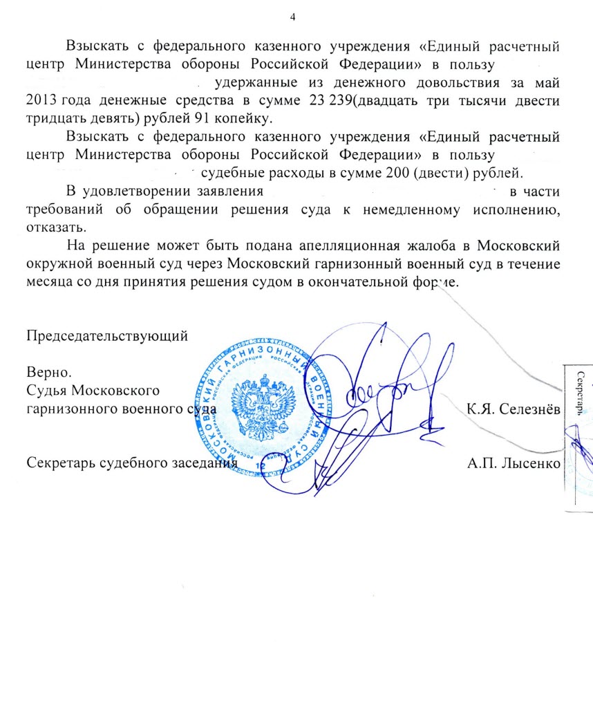 Взыскать с ФКУ «Единый расчетный центр МО РФ» судебные издержки, связанные с оплатой госпошлины в размере 200 рублей."