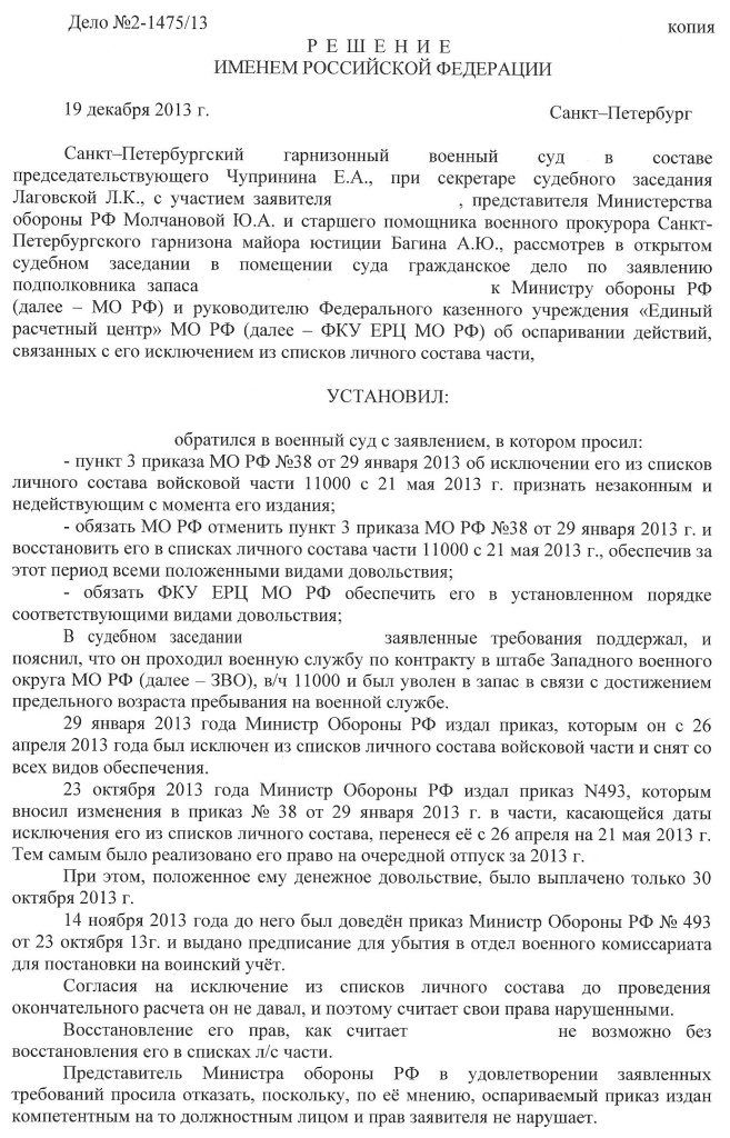 "Признать неправомерными действия начальника ФКУ «Единый расчетный центр МО РФ», связанные с удержанием с меня излишне начисленной денежной суммы в размере __________ рублей, и обязать его произвести выплату мне указанной денежной суммы.