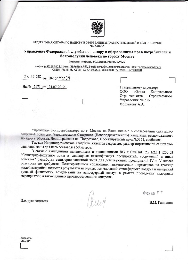 3. Дом построен в санитарно–защитной зоне ныне действующего Черкизовского северного кладбища (СанПиН 2.1.2882-11 п. 4.3), что является нарушением требований СанПин 2.2.1/2.1.1.1200-03 и СНиП 2.07.01-89*. Разрешение на изменение границ санитарно-защитной зоны органами Роспотребнадзора не выдавалось.