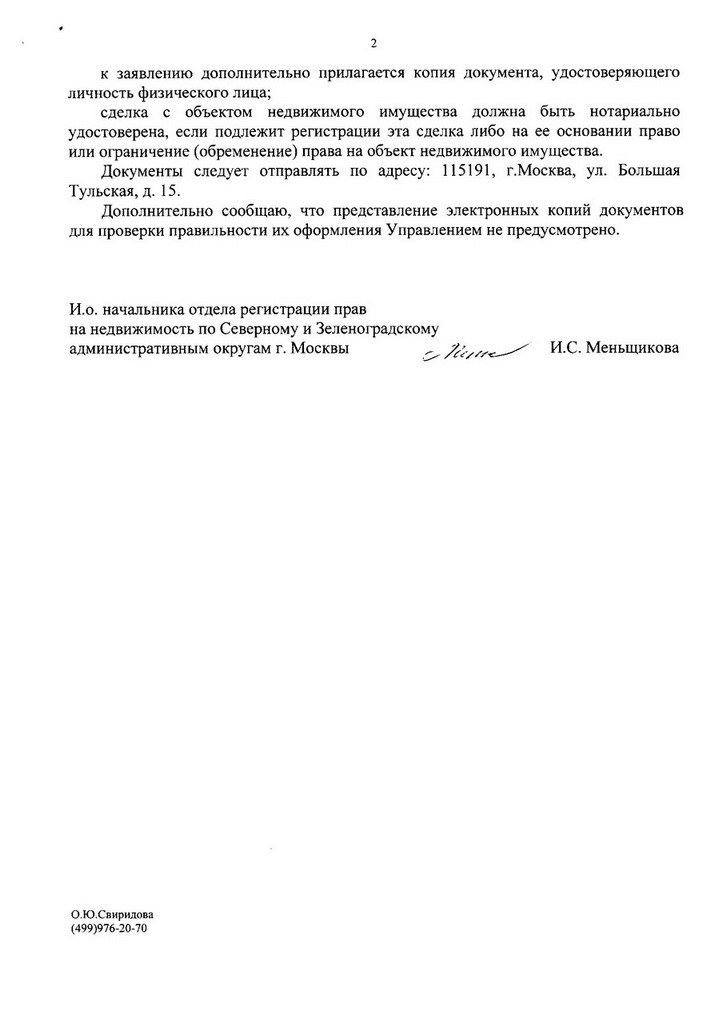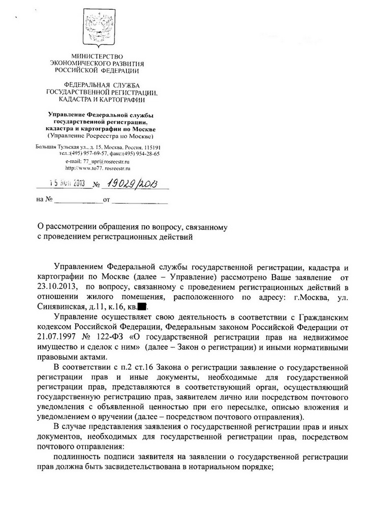 Я некоторое время назад интересовался здесь куда адресовать документы на регистрацию права собственности по Синявинской, 11 при направлении почтовым отправлением. Ответ мне не дали, узнал сам. Прикладываю копии документов, может кому-нибудь будут полезны.