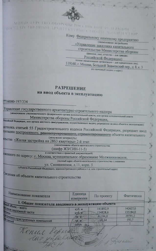 Вместе с тем, 25 апреля 2013 года управлением государственного архитектурно-строительного надзора Минобороны России выдано разрешение № RU77214000-197/362 на ввод в эксплуатацию построенного объекта капитального строительства «Жилой комплекс с социальной инфраструктурой».