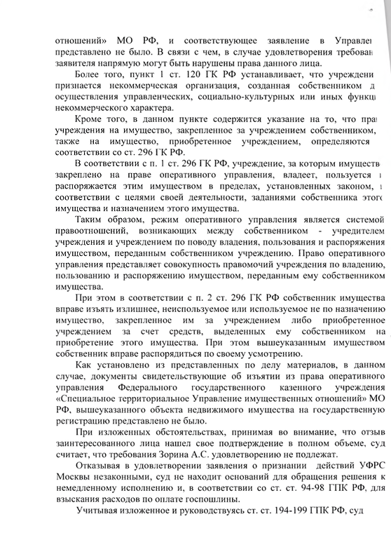 Подана апелляционная жалоба на решение Симоновского районного суда г. Москвы, которое покрывает решение Росрестра, ставя право оперативного управления выше права собственности и фактически лишая смысла предоставление в собственность военнослужащим жилья от имени государства, которое это же государство запрещает регистрировать в собственность. Основной довод апелляционной жалобы -