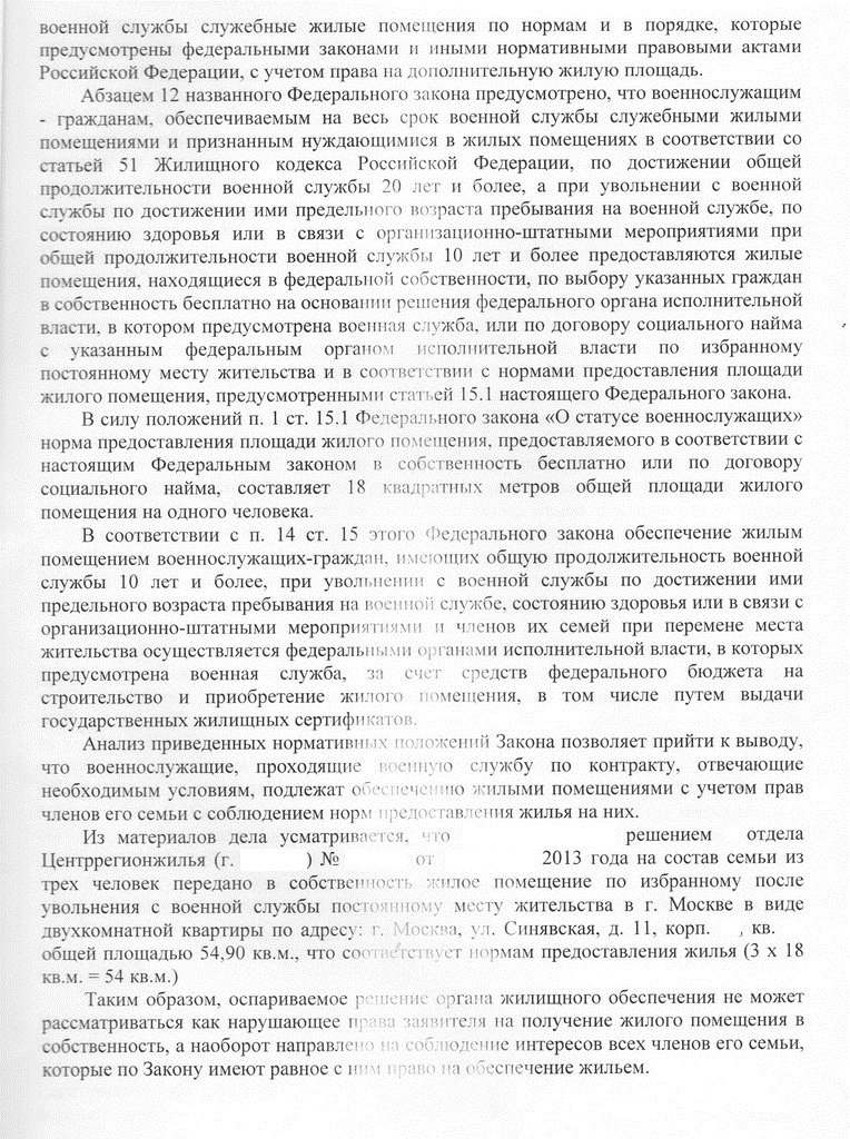 В обоснование заявленных требований указал, что проходит военную службу по контракту в ФГКУ <данные изъяты>, выслуга в календарном исчислении составляет <данные изъяты>. Жильем от Министерства обороны не обеспечен, проживает с ДД.ММ.ГГГГ в общежитии по <адрес>. Ему и членам его семьи в количестве 4-х человек, включая сына ФИО1, была распределена трехкомнатная квартира площадью <данные изъяты> по <адрес>. В последующем в предоставлении ему указанной квартиры было отказано по тем основаниям, что у его сына ФИО1 имеется на праве собственности жилое помещение площадью <данные изъяты> при зачете которого распределенная квартира намного превышает норму предоставления. С указанным решением он не согласен. Его сын ФИО1 проживает отдельно от него и его семьи, в связи с чем, не подлежит учету при предоставлении жилого помещения. В соответствии со ст. 15.1 Федерального закона "О статусе военнослужащих" его семье составом 3 человека может быть предоставлено жилое помещение площадью не более 63 кв. м (18 x 3 + 9). В соответствии с Приказом Министра обороны Российской Федерации от 2011 г. N 1450дсп превышающие норму 16,4 кв. м он может оплатить за счет собственных средств.