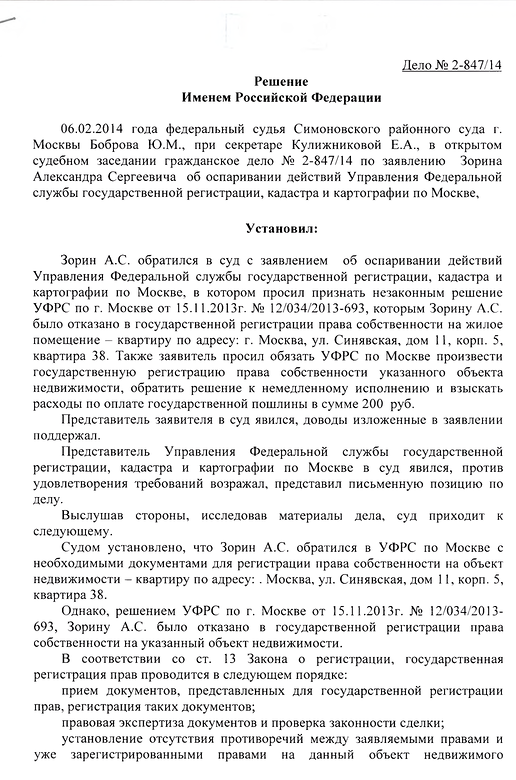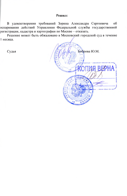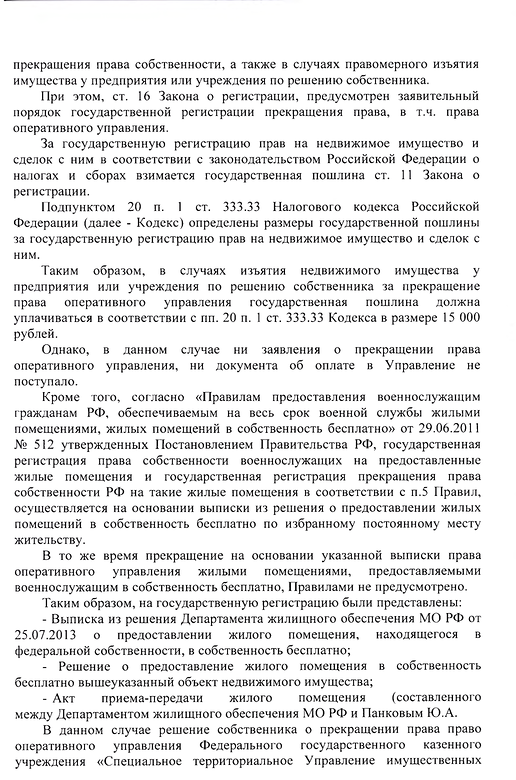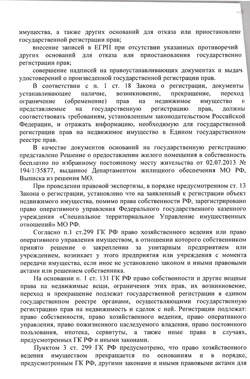 Подана апелляционная жалоба на решение Симоновского районного суда г. Москвы, которое покрывает решение Росрестра, ставя право оперативного управления выше права собственности и фактически лишая смысла предоставление в собственность военнослужащим жилья от имени государства, которое это же государство запрещает регистрировать в собственность. Основной довод апелляционной жалобы -