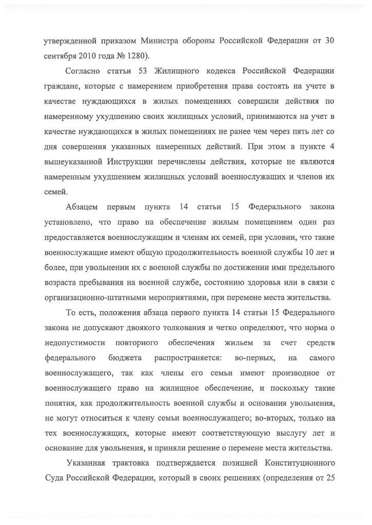 Да я о том, что в указанном определении КС нет ясной мысли, нигде не сказано, что семья военнослужащего из пяти человек не может получить жилье от военного ведомства, если этот военнослужащий был когда-то обеспечен жильем папой. Там был обеспечен один человек, сейчас претендует на получение семья 5 человек. Даже за вычетом ранее полученных метров не вижу препятствий. Если я ошибаюсь, процитируйте мне, где КС это запретил?