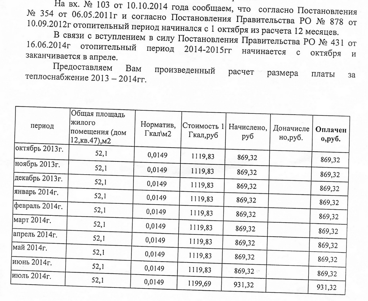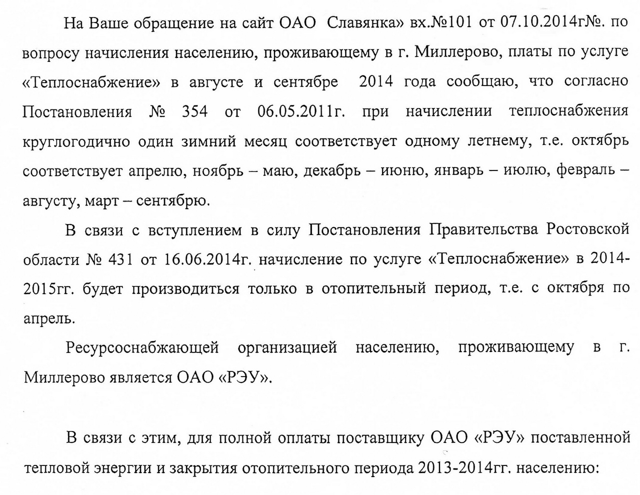 Однако УК Славянка выставила счет и за эти месяцы. Объяснение такое: это вы доплачиваете за отопительный сезон 2013-2014 г. так как оплата идет 12 месяцев не с января по декабрь, а с октября по сентябрь. Ссылаются на ПП РФ 354 и 878 (областное). Ни в том ни в другом про этот бред нет ни слова.