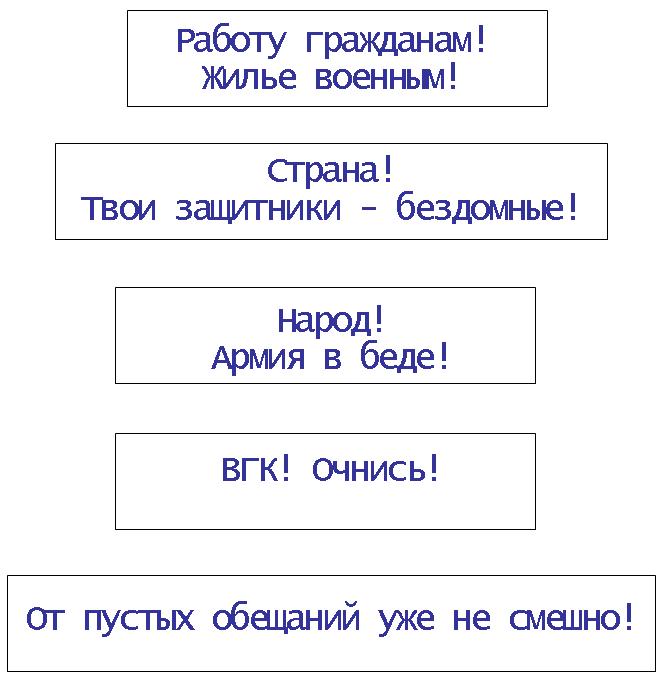 Уважаемые товарищи! Митинг состоится 21 мая 2011 года (суббота) в г.Москва Под девизом:"Построение обманутых полков" - в защиту прав военнослужащих, граждан уволенных с военной службы и членов их семей. Митинг проводится Инициативной группой Интернет форума правовой взаимопомощи военнослужащих www.voensud.ru совместно с Союзом Советских офицеров и Движением в поддержку армии. Цель митинга: Создание общественного резонанса в обществе. Доведение до всех граждан РФ о том, что информация распространяемая руководителями страны по обеспечению всех военнослужащих и граждан, уволенных с военной службы постоянным жильём, не соответствует действительности. До сих пор таких необеспеченных сотни тысяч. Процесс заселения в жилые помещения затягивается на неопределенные сроки из-за бюрократизма чиновников и коррупции. Место проведения: Пушкинская площадь (ст. метро Пушкинская, между памятником А.С. Пушкину и кинотеатром Пушкинский. Время: с 12:00 до 14:00. Форма одежды (по возможности) военная. Статус митинга Всероссийский. Те кто не сможет приехать в Москву из отдалённых регионов, и кто не равнодушен к жилищным проблемам военнослужащих, планируют проведение подобных мероприятий на местах в регионах. Ничего страшного если даты проведения будут немного отличаться, наша армия пока едина и строй у нас единый! Мурманчане молодцы! Показали как надо действовать!
