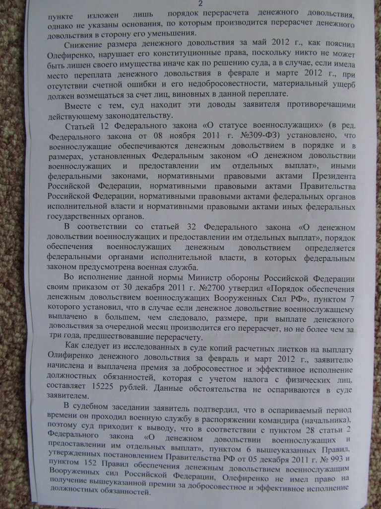 по подобному вопросу мы с вами помним совсем свежее решение (правда не по военнослужащим но всё же) Верховного Суда от 20.01.2012г. № 59-В11-17 "дважды перечисленная заработанная плата и приравненные к ней платежи перечисленные работнику дважды по ошибке работодателя возврату не подлежат, так как такая ошибка не является счетной, вина и неправомерные действия в этом случае со стороны работника отсутствуют"sportsmen, предположу, что дело в двойной выплате. По таким случаям практика противоречивая.