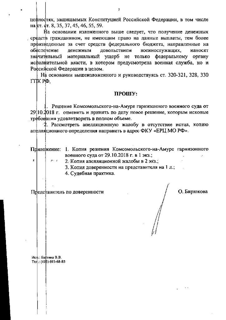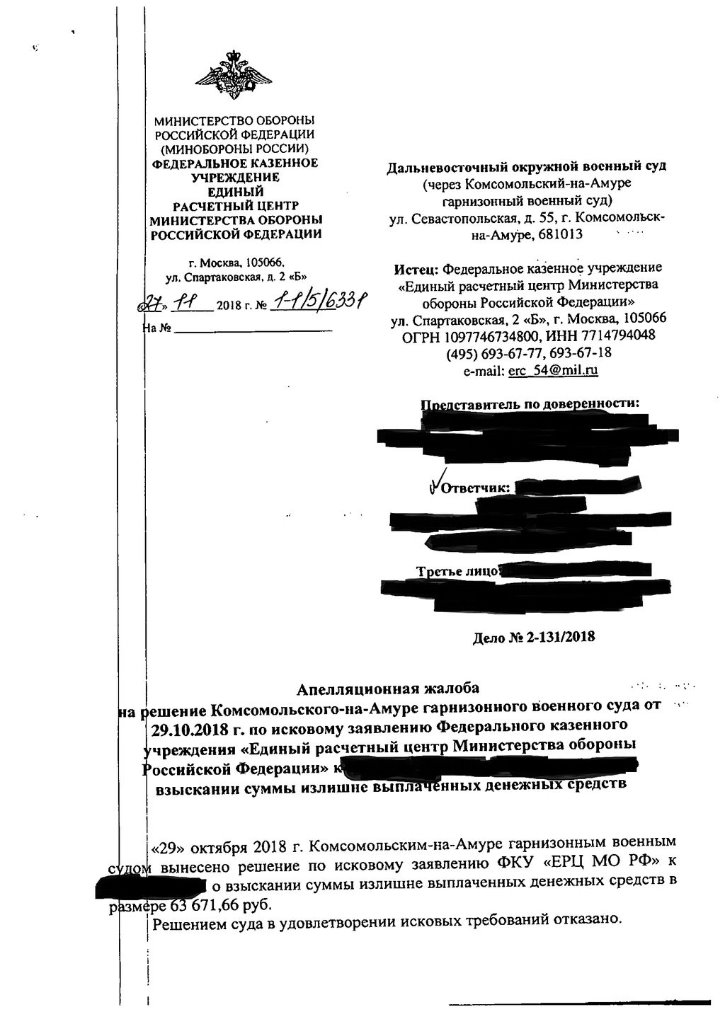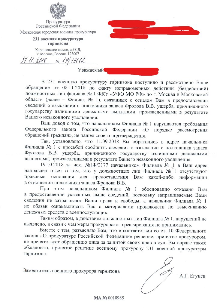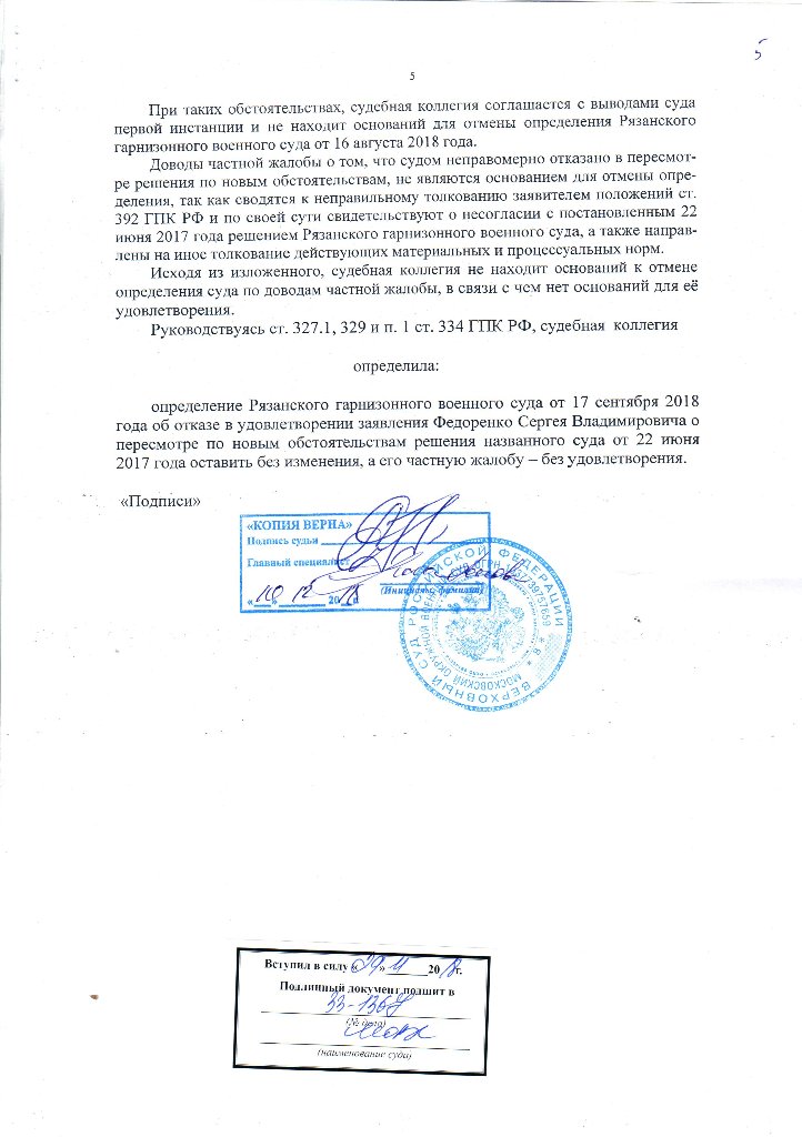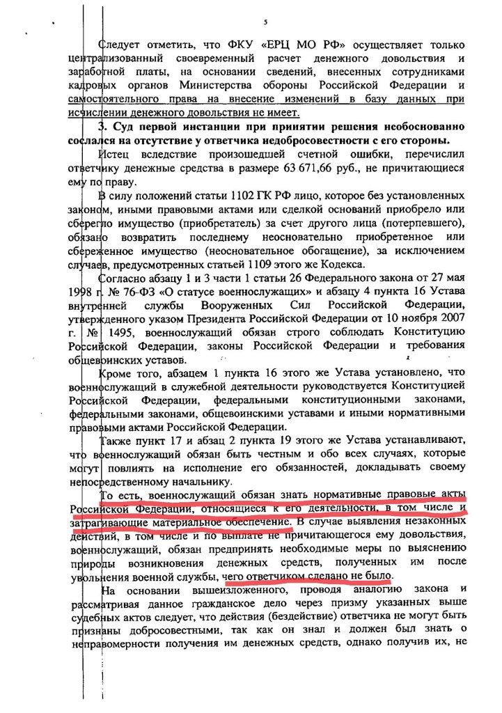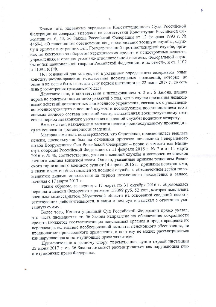 Согласно решения ГВС: «Что касается ст. 1109 ГК РФ предусматривающей, что пенсия, предоставленная гражданину в качестве средства к существованию, при отсутствии недобросовестности с его стороны и счетной ошибки возврату не подлежит, то здесь законодатель руководствуется невозвратностью сумм, полученных добросовестно и в качестве единственного средства к существованию. Поскольку с момента восстановления Федоренко С.В. были произведены все положенные выплаты по денежному довольствию за предыдущие 8 месяцев, то полученную выплату нельзя рассматривать по отношению к нему как единственное средство к существованию.
