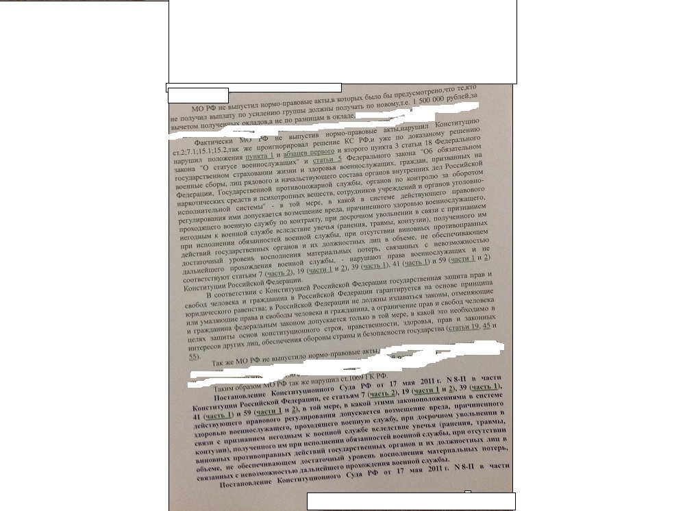 Считаю,что МО РФ нарушило судебное решение от 17 мая 2011 г. Конституционного Суда Российской Федерации в той части решения (постановление, определение) ,что оно окончательно и не подлежит обжалованию, вступает в силу немедленно после его провозглашения либо со дня опубликования в "Собрании законодательства Российской Федерации", иных изданиях. Решение действует непосредственно и не требует подтверждения другими органами и должностными лицами. Нормы, признанные не соответствующими Конституции РФ, не подлежат введению в действие и применению (ст. 79 Федерального конституционного закона от 21.07.1994 N 1-ФКЗ "О Конституционном Суде Российской Федерации").В данном постановлении Конституционный суд предписал федеральному законодателю не позднее чем в шестимесячный срок внести в действующее правовое регулирование поправки с целью совершенствования публично-правового механизма возмещения вреда здоровью военнослужащих, ставших инвалидами вследствие увечья (ранения, травмы, контузии), полученного при исполнении обязанностей военной службы, с тем чтобы в течение всего периода утраты трудоспособности им гарантировалось адекватное возмещение вреда, сопоставимое по своему объему с денежным содержанием.МО РФ поставил под сомнения выводы КС РФ,не выпустив подзаконные акты новые,образца Приказа Министра обороны РФ от 26.04.2013 N 325