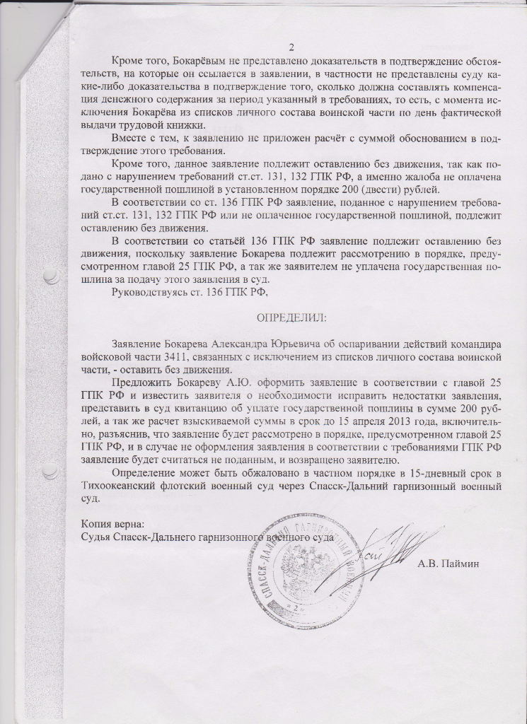 1.Я обратился в суд с заявление об предоставлении мне акта об отказе получения имущества, акта о сдаче войскового имущества, акта об отказе написания рапорта. Мне отказали в получении этих актов т.к. уничтожены в 2014 году, но в 2015 году в очередном суде эти документы были предоставлены на обозрение суду. Судья неоднократно звонил мне по средствам сотовой связи( есть детализация звонков),чтобы я забрал свое заявление,т.к. решение будет вынесено не в мою пользу. По мимо этого, этот же судья приезжал в нашу войсковую часть и прочитал "лекцию" о том,что не следует обращаться в суд, тратить деньги на адвокатов, т.к. суд всегда будет на стороне командования .