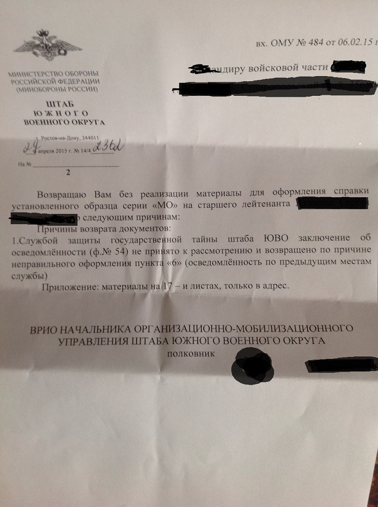 уважаемые борцы, подскажите мне пожалуйста, что мне можно сделать в такой ситуации...3й раз мне возвращают документы из штаба округа, в очередной раз пришел официальный ответ.