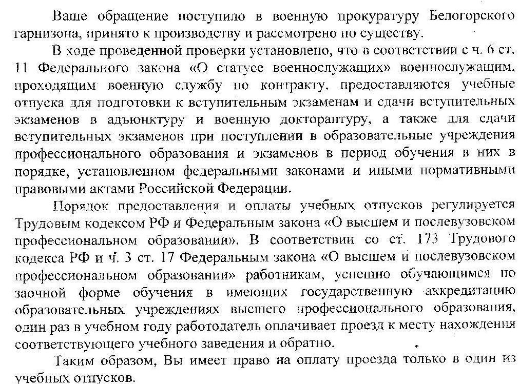 добрый день, подскажите поржалуйста. Ранее , когда командиру части поднимали вопрос об учебном отпуске он отмахивался словами "вашего учебного заведения нет в перечне разрешенных для обучения военнослужащими... ну что то типа того, мол, меня уже так подлавливали,поэтому я эту тематику хорошо изучил!" я обращался к Вам, написал рапорт, но отказал словами "товарищ лейтенант, наша в/ч постоянной БГ и ваше присутствие здесь просто необходимо" имхо. у меня уже сессия идет,уже прошло 12 дней от начала и 12 дней до окончания. о