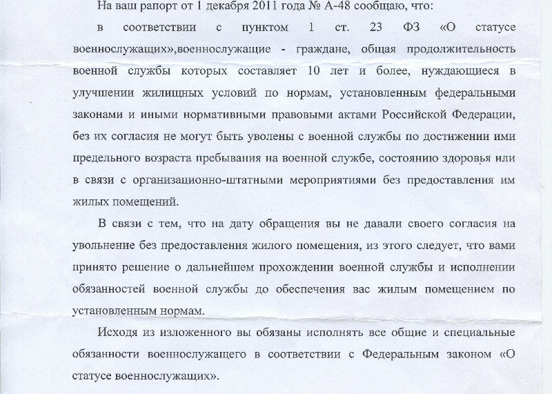 вот только приехала из части, получив официальный ответ на мой рапорт, какие приняты меры по удовлетворению моего рапорта от июля месяца на увольнение после предоставления жилья (предельный возраст наступил в 2006, контракт закончился в ноябре 2010 года, признана "ограниченно годной" уже дважды)7. Примерно такая же лажа, такого же уровня происходит с бесконтрактниками-добровольцами-запредельщиками, что яко бы у них есть выбор, и они сами выбрали этот путь. А выбор таков, или вечно стоять в очереди на жилье, в случае увольнения, т.к. в первую очередь его будут предоставлять не уволенным, или как раз быть тем самым не уволенным, у которого остается шанс получить (не понятно когда) долгожданное жилье.