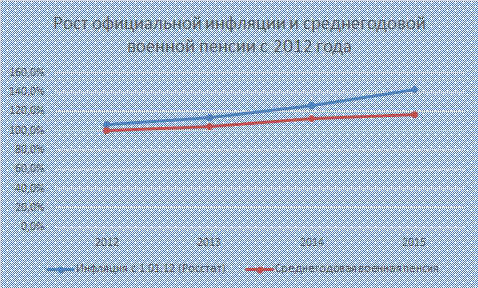 А официальный уровень годовой инфляции определяется у нас не законом о бюджете, а Росстатом на конец года и в последнее время всегда превышал заложенный в бюджете. Но Правительство, выполняя Указ № 604 почему-то считало годовую инфляцию по уровню, заложенному в бюджете. То есть прибавляло 2% не к официальной инфляции Росстата, а к уровню инфляции, заложенному в бюджете. В результате в 2013 году военные пенсии повысили на 7,5%, вместо 8,45%, в 2014 на 7%, вместо 13,36% и в 2015 на 7,5%, вместо 15%!