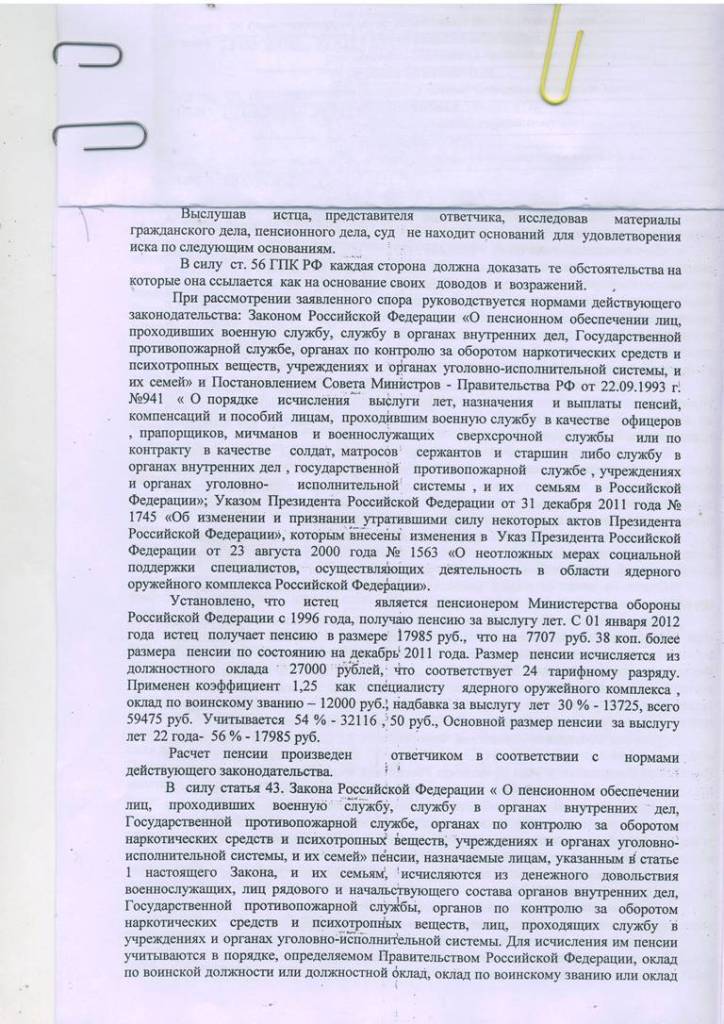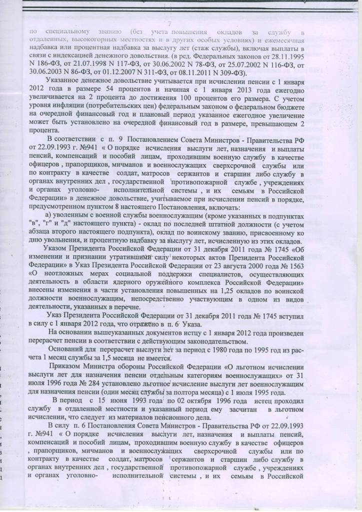 В настоящее время создалась ситуация, когда я, как военный пенсионер, многократно унижен: мало того, что выслуга лет за период моей службы (на должностях, подпадающих под перечень, выполнение обязанностей по которым, связано с эксплуатацией ЯБП) с 1980 года по 1993 год исчислялась 1 к 1, мало того, что с 01.01.2012 года оклад по воинской должности для исчисления военной пенсии берется из расчета 1,25 вместо применяемых ранее 1,5, так еще и исчисление пенсии стало осуществляться из пониженного объема денежного довольствия на 54%. Этим самым, как указано выше, нарушаются положения применяемых законов, Конституции РФ и норм международного права. Фактическое увеличение размера получаемой мной пенсии с 01.01.2012года не может быть основанием для отмены действующих законов, так как исчисление производится с повышенных окладов, как и положено по закону. Закон Российской Федерации от 12.02.1993г. №4468-1 не оговаривает размер пенсии, выражаемой в рублях в конкретной сумме, а выражает его уровень (объем) в процентном соотношении к размеру соответствующего денежного довольствия.