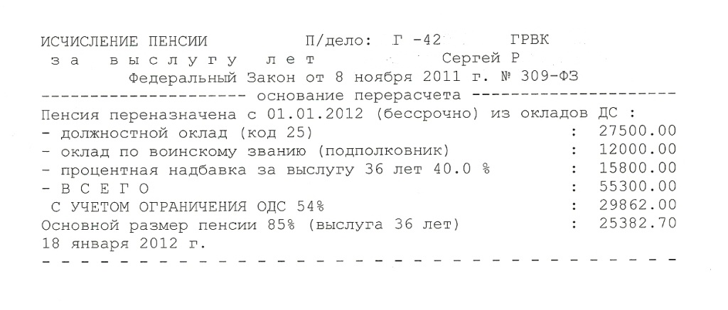 Складываем ОВЗ,ОВД,ПНВЛ: 12000+24000+14400 = 50400 - это и есть ДД. Но в 2012г при расчёте пенсии учитывается не 100% ДД, а только 54%. То есть 50400 Х 54% = 27216р. Вот с этой суммы высчитывается пенсия. Мы решили, что у него полная выслуга - 85%. 27216 Х 85% = 23133.60руб. Вот такая пенсия у него в январе 2012г.