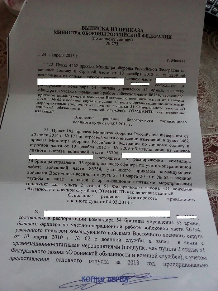кроме того, с отпусками не все до конца ясновыписок из приказа об исключении из списков части я не получил по причине отсутствия приказа. В течение последующего времени, дважды в неделю я интересовался готовностью приказа, на что получал отрицательный ответ.
