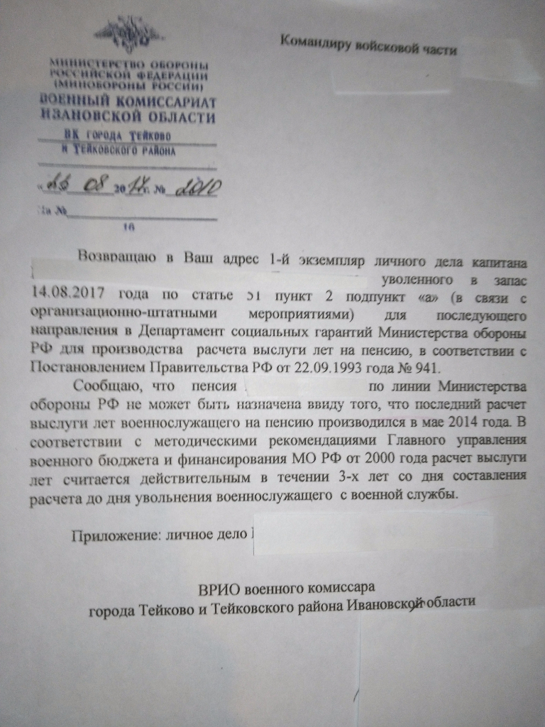 Личное дело пришло в военкомат? Пришло. Значит после подачи Вами заявления о назначении пенсии у военного комиссара возникла обязанность назначить Вам пенсию по выслуге лет. Если ему не понравился подсчет выслуги лет, который имелся в личном деле, то он обязан был сам посчитать и реализовать Ваше право на пенсию на основании личного дела. А вот с целью уточнения правильности расчета он мог (или обязан) был направить личное дело на повторный расчет выслуги лет. Но лишать Вас права на пенсию он не мог.