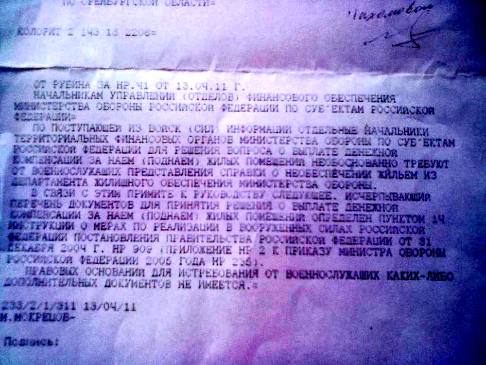 требование справки о необеспечении жильем обосновано здравым смыслом и п.11 Инструкции, утвержденной ПМО 2005 г.№ 235 поскольку денежная компенсация за наем (поднаем) жилья является альтернативной формой жилищного обеспечения и выплачивается военнослужащим, НЕ ОБЕСПЕЧЕННЫМ ЖИЛЫМИ ПОМЕЩЕНИЯМИ. Иначе каким образом кадровик и КВЧ удостоверятся о необеспечении жильем всл перед изданием приказа о выплате компенсации???!Мартышка к старости слаба глазами стала", так поудобнее будет: