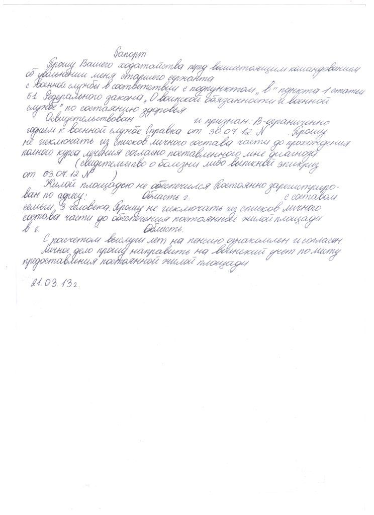 Привет !!! Скиньте пожалуйста рапорт на увольнение по здоровью категория "В". Как правильно писать? Там про положенные денежные выплаты, вещёвка и всё такое. ДСН получил, жильём обеспечен. Приватизировать пока не хочу. Спасибо заранее!