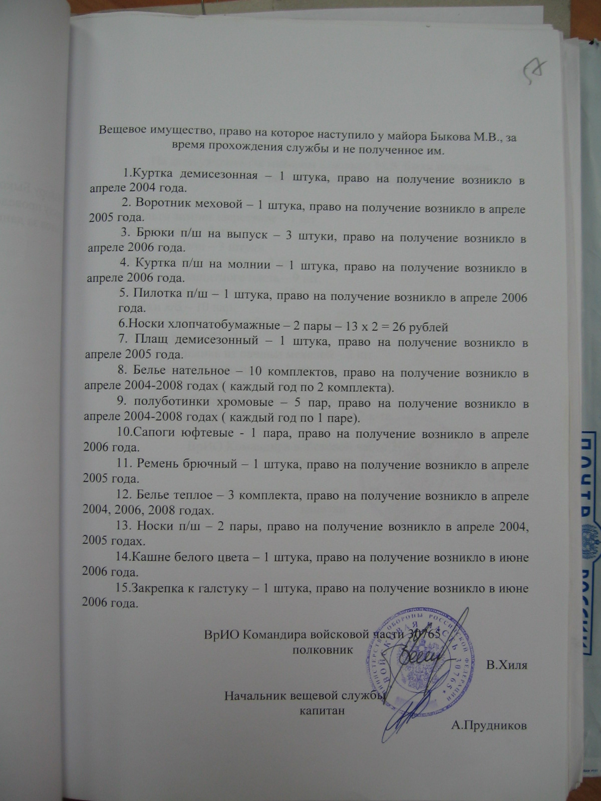 Согласно телеграммы начальника тыла СибВО от 21 сентября 2009 года № 14/2223 в целях своевременного и бесперебойного обеспечения военнослужащих воинских частей и формирований СибВО вещевым имуществом было запрещено выдавать взамен положенного вещевого имущества увольняемым военнослужащим костюмы полевые зимние и летние, фуражки полевые, а также носки и полотенца. При расчете увольняемых военнослужащих было рекомендовано выдавать предметы повседневной формы одежды, теплые вещи, снаряжение и другое имущество излишествующее сверх потребности части.
