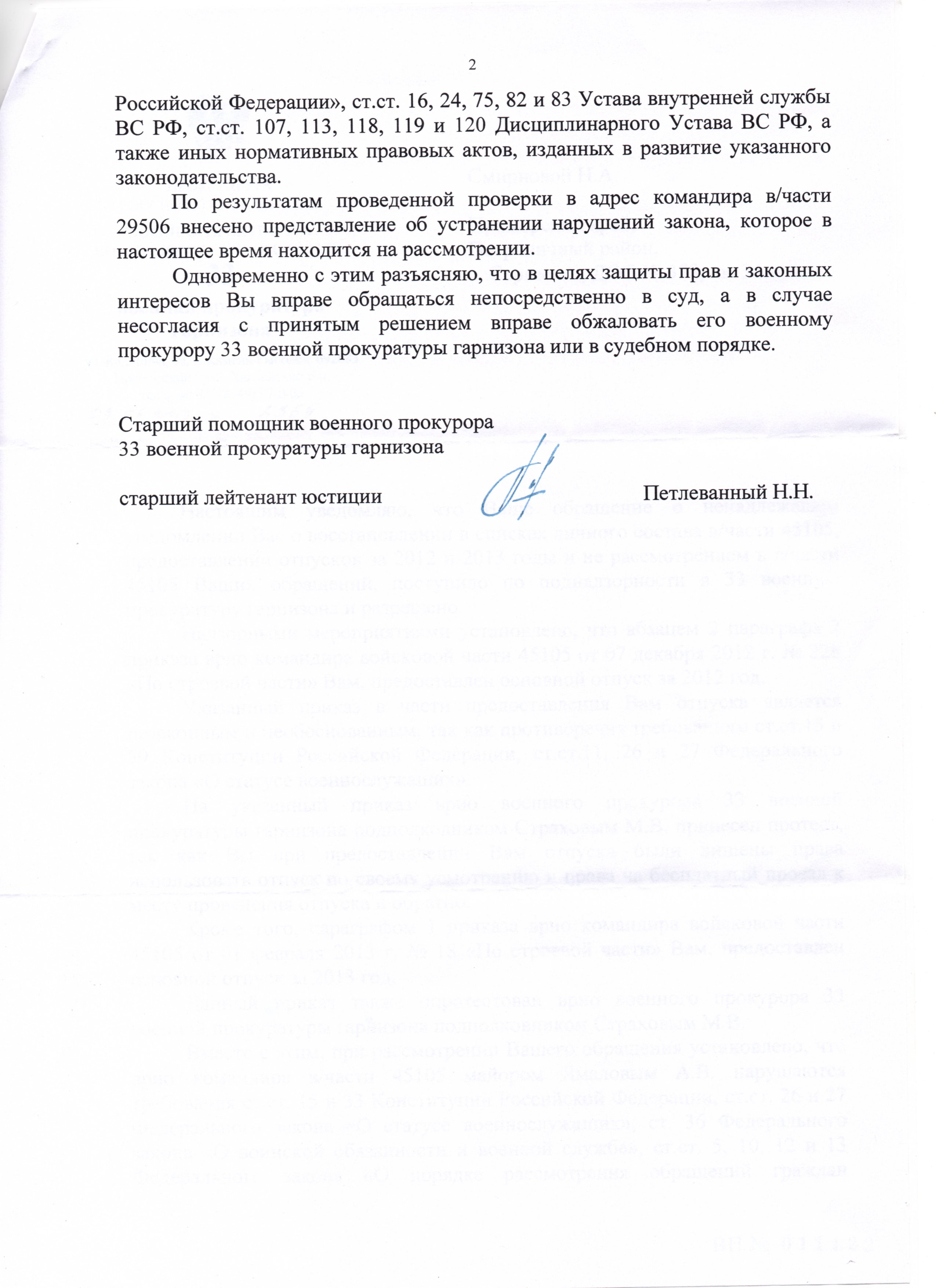 Здравствуйте, форумчане! Пришла выписка из приказа об исключении меня из списков личного состава части, но отпуск я не отгулял пропорционально прослуженному времени за 2013г. Хочу подать в суд на неправомерное исключение из списков части, т.к. отпуск не отгулял. Как думаете выиграю суд или нет, может были суд. решения по такому вопросу? Если выиграю то денежное довольствие выплатят только на количество неотгулянного отпуска или на отпуск + время затраченное на судебные пересылы ( около 1-1,5 мес.). Заранее благодарен.
