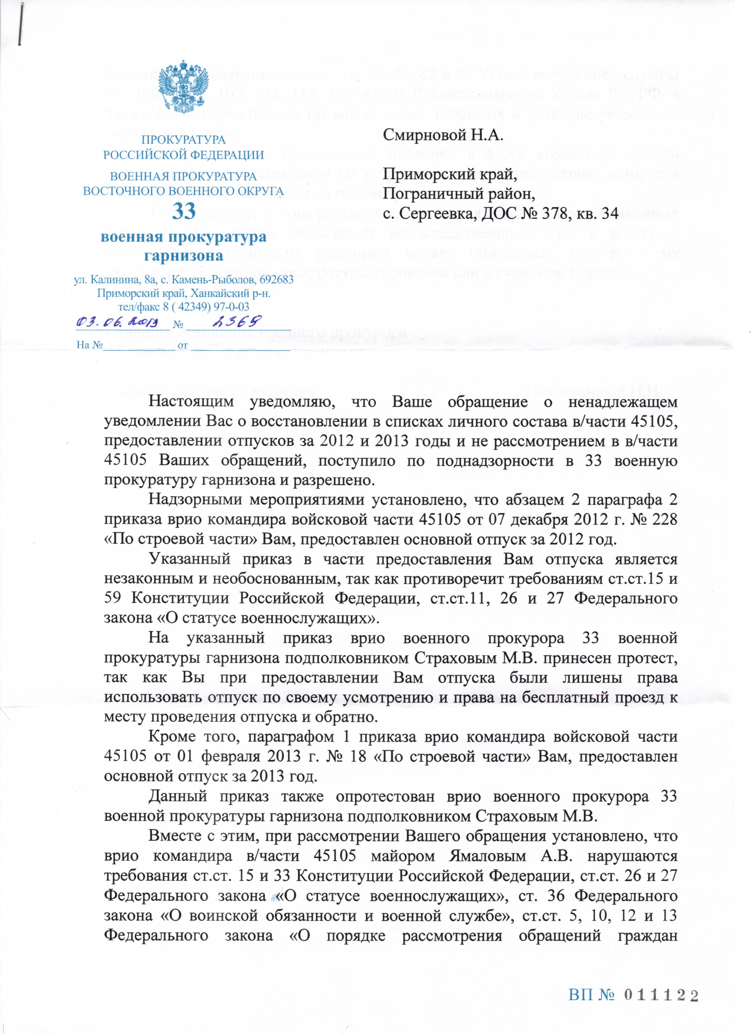 ХЭЛП МИ!!! Так никто и не ответил на мой пост за три дня,КУДА ВСЕ пропали, неужели ни кто не заходит на данную страничку форума? ЕСЛИ КТО сможет пошу ответить на мой пост!Добрый день уважаемые форумчане!Необходима Ваша консультация. Суть проблемы в следующем: 27 февраля по направлению КЧ лег в госпиталь. 13 марта в часть пришел приказ об исключении меня из списков части с 28 февраля. Выписался из ВГ 29 марта, 30 марта ознакомился с приказом об исключении из списков части с 28 февраля, в этот же день подал рапорт КЧ о направлении меня в ВГ на основании показаний к госпитализации(запись в мед. книжке). КЧ отказал мне в направлении в ВГ сославшись на то что я по приказу исключен из списков части с 28 февраля. Лег в госпиталь без направления, положили сказав что направлят запрос КЧ о моем статусе. Выписался 29 апреля из ВГ, с 30 апреля проходил лечение в стационаре обычной больницы, так как в ВГ меня уже не взяли(на запрос начальника ВГ КЧ не ответил) закончил лечение 05 июля. Подал жалобу в суд на неправомерные действия МО по поводу незаконного исключения меня из списков части. Проблема в том что 01 августа будет 20 календарей(право на пенсию) нужно дотянуть. 10 июля было предварительное рассмотрение моей жалобы, сам суд назначен на 29 июля. Возникает вопрос можно ли восстановиться в списках части или хотябы продлить исключение по август, за время нахождения на лечении отпуск пропорционалный-40/12*5=16,66 17 дней + время на проезд в отпуск туда и обратно во Владивосток 14 дней(до этого давали 7 суток за январь-февраль без проезда к месту проведения отпуска) какраз получится с 06 июля + 17 дней отпуска +14 дней на проезд выходит 5 августа. Вопрос в том что смогу ли я получить время на проезд в отпуск к месту проведения отпуска и обратно к отпуску получившемуся за время болезни???? Буду очень признателен за помощь или консультацию в данной ситуации!!!