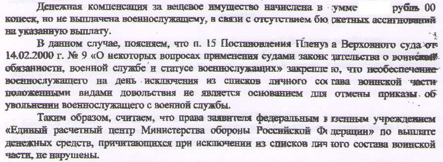 Можно добавить... В соответствии с пунктом 250 Руководства о финансовом обеспечении и особенностях бюджетного учета Вооруженных Сил Российской Федерации, утвержденного приказом МО РФ №250 дсп от 7 мая 2008 года, выплата денежного довольствия военнослужащим, увольняемым с военной службы, должна быть произведена не позднее дня исключения их из списков личного состава воинской части, а при предоставлении отпуска при увольнении – не позднее дня, предшествующего началу отпуска. Данное положение закона должностными лицами было нарушено.