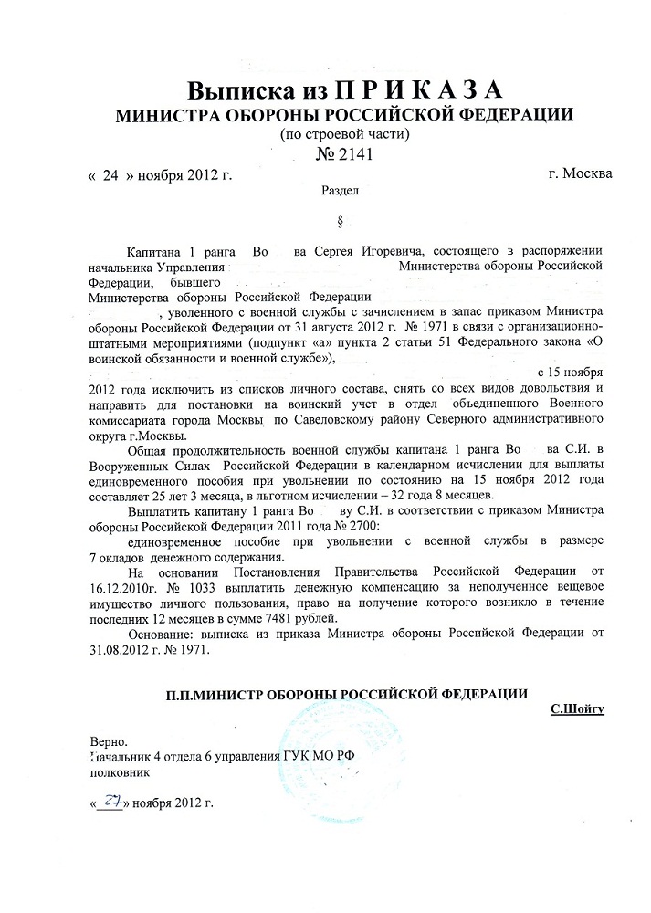 31.05. 2012 - приказ МО на увольнение