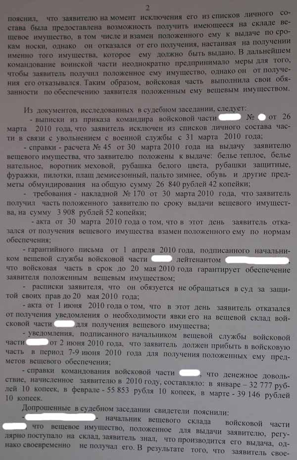 А второй раз когда я подавал в суд практически по тем же основаниям, правда чуть более расширенным (был включён срок - с момента проведения ОШМ по части, до исключения из СПЧ, для получения вещёвки. ), суд удовлетворил мои требования, но частично. Обязал КЧ выдать положенные мне вещи. (хотя в своих заявлениях , как в первом, так и втором, я не просил выдать вещевку. В первом заявлении я ссылался на решение пленума ВС №9 и просил восстановить меня в СПЧ. А во втором заявлении я просил признать нарушения порядка увольнения из ВС, где само увольнение произошло по законным основаниям, а на момент исключения в/с не обеспечен каким-либо довольствием, + просил внести изменения в приказ об моём искл из СПЧ, в части изменения даты моего исключения. )