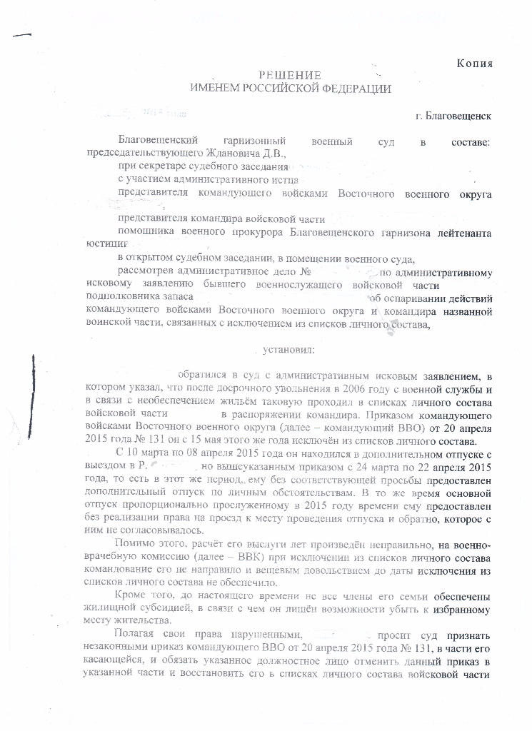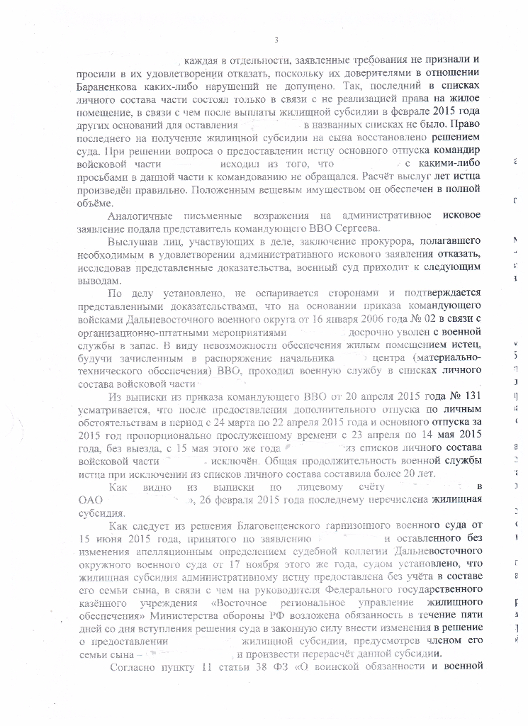 #6657приветствую форумчан, прошу помощи и совета: в прошлом году сообщал о выплате субсидии не на всех членов семьи(на учете стояло пятеро, но внебрачного ребенка пытались кинуть, суд выйграл, в апелляции решение устояло, суд обязал отменить решение о выплате на четверых, внести изменение в решение с учетом сына и выплатить, 2 отделу отменить решение о снятии с учета нуждающихся, восстановить в списках нуждающихся на получения жилья. Решение суда от 15 июня), 15 мая исключили из списков в/ч (уволен был в 2006, находился в распоряжении до обеспечения жильем), субсидия на момент исключения получена на четверых, подал в суд с просьбой отменить приказ на исключение до обеспечения субсидией на всех членов семьи, суд проиграл, апелляция не помогла теперь кассация. Для составления апелляции обращался к адвокату но видимо аргументов было не достаточно, в настоящее время жду перечисления остальной части субсидии, жильем не обеспечен получаю пенсию, снимаю квартиру(пытаюсь у военкомата получить за поднаем), избранное место жительства С-Петербург, теперь решил просить помощи у форума, скан решения дальше