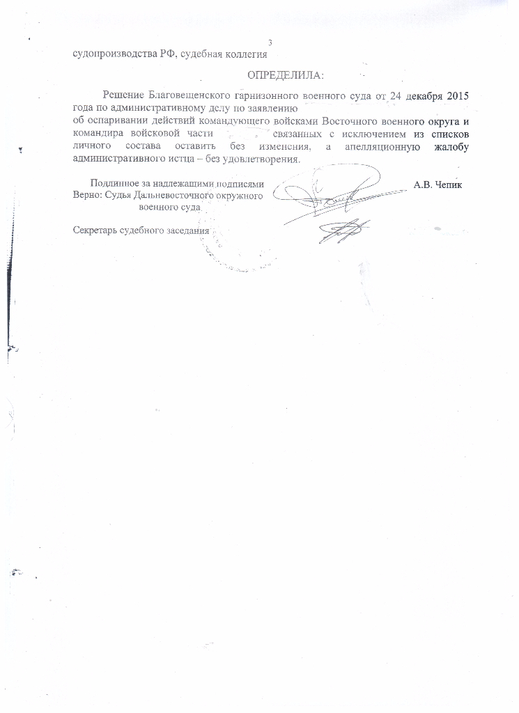 #6669рапорт на отпуск не писал, уехал 10 марта в дополнительный ВБД с проездом, пока был в отпуске составили проект приказа на исключение и отправили в округ, где я хочу провести основной отпуск не спросили тупо по месту прохождения службы, далее, дембельский отпуск не просил предоставили по месту прохождения в/службы. О субсидии узнал приехав из отпуска 10 апреля, командир был на переподготовке в Питере два месяца сказал, что проект составлялся без него, 17 апреля заяву в суд на не полную субсидию, 24.04, 29.04, 05.05, 08.05,14.05, ездил в гарнизонный суд. 08 мая узнал что по мне состоялся приказ ВВО об исключении, в глаза его не видел, нигде не расписывался,15 мая исключили из списков, увидел приказ прочел, затем 16 мая еле убедил выдать справку о неиспользованных ВПД на себя и члена семьи в основной отпуск получил личное дело и стал на учет в местный военкомат. Затем суд 15 июня вынес решение о выплате субсидии и восстановлении в списках нуждающихся, и я написал новую заяву в суд на обжалование исключения и др. нарушений(ВВК, подсчет выслуги, неполучение вещ им-ва, и неполучение субсидии в полном объеме, рассмотрение отложили до вступления в силу решения о получении субсидии на члена семьи)24 декабря рассмотрели за два часа, ни один из моих доводов судья не принял во внимание, в отмене приказа об исключении было отказано, апелляцию вы читали...