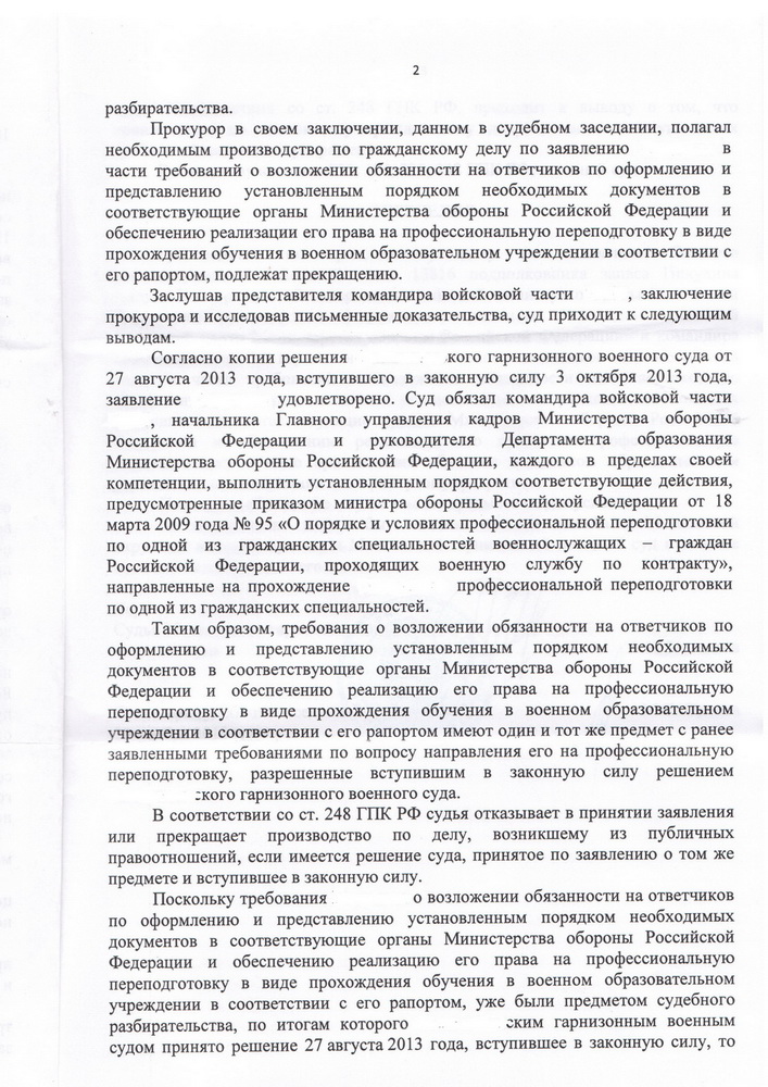 2. Обязать Министра обороны РФ отменить приказ Министра обороны РФ от 10 июля 2013г. № 551 раздел ХХХХХ в части касающейся исключения меня с 31 июля 2013 года из списков личного состава войсковой части ХХХХХ.