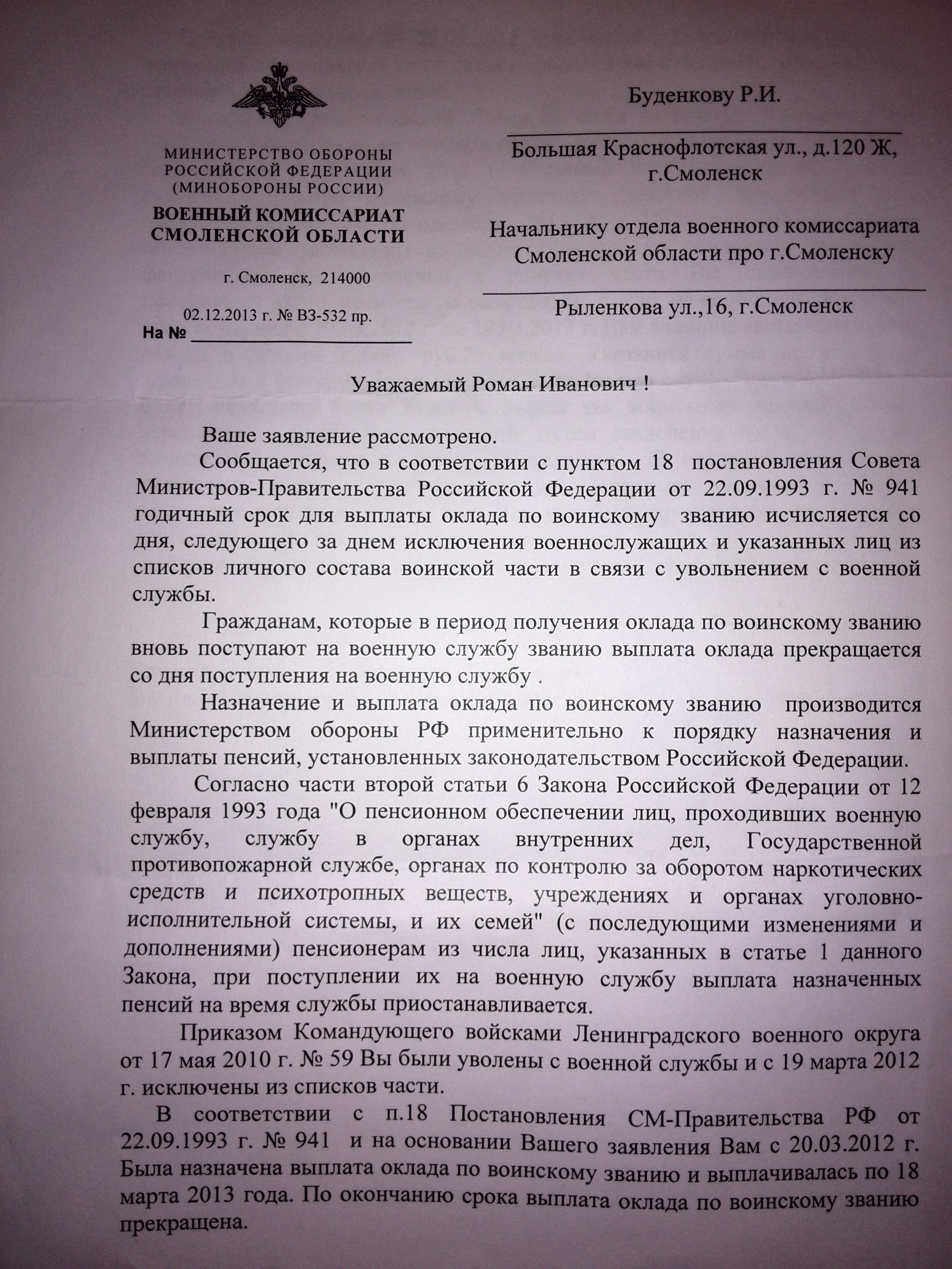 Ввиду неопределенности моего статуса, заверить установленным порядком копии прилагаемых документов (выписки из приказа Министра обороны РФ) не представляется возможным. В заверении копии моего рапорта о направлении на переподготовку мне было отказано 23 июля 2013 года.