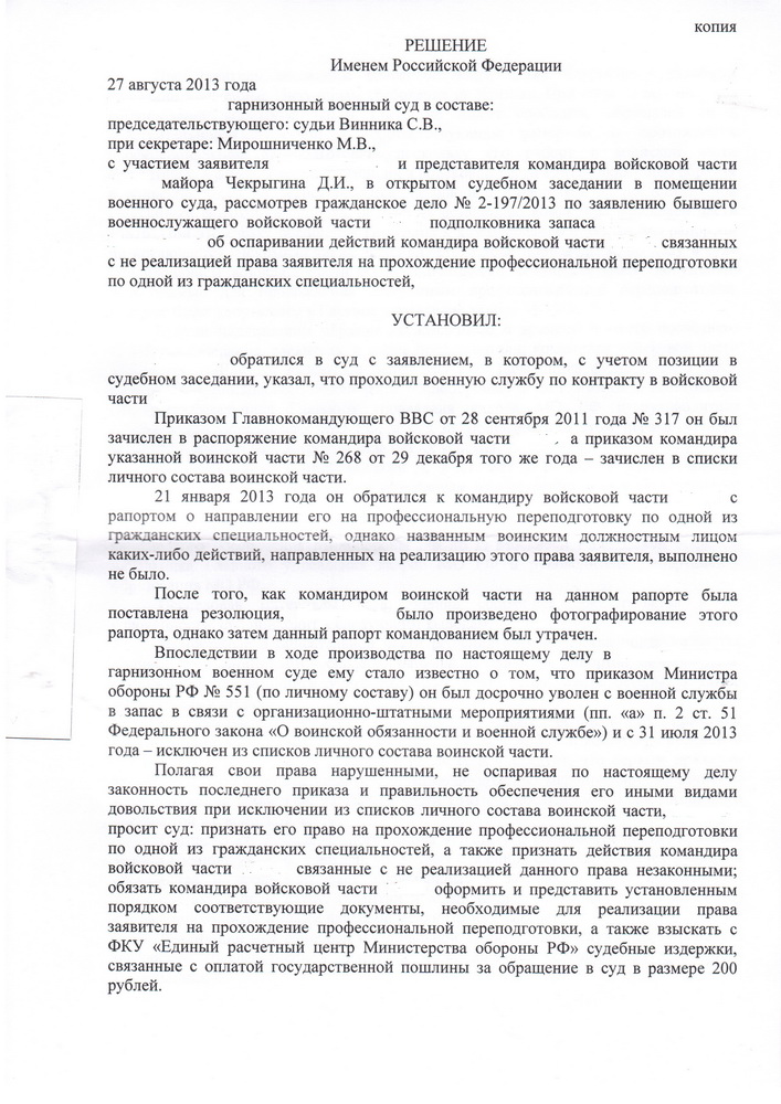 Таким образом, мною неоднократно предпринимались попытки добиться от командования войсковой части ХХХХХ реализовать мое право на профессиональную переподготовку по одной из гражданских специальностей в соответствии с приказом Министра обороны РФ 2009 года № 95. Все беседы проходили в присутствии сторонних и незаинтересованных свидетелей. О моем желании пройти переподготовку и попытках решения данного вопроса с командованием войсковой части ХХХХХ могут свидетельствовать ХХХХХ и другие военнослужащие.