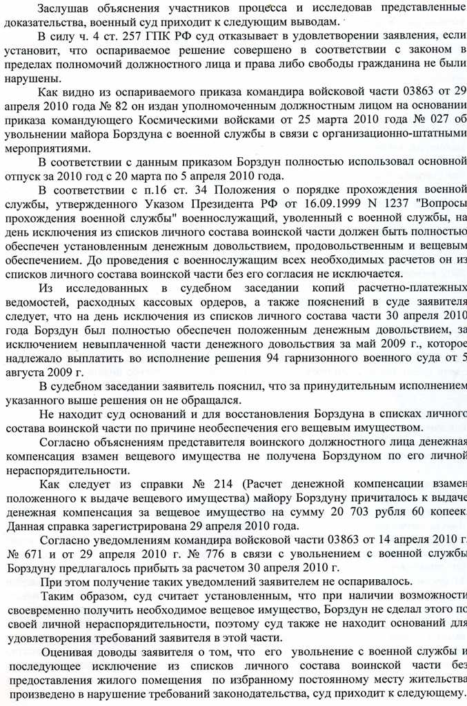 Расчёт по денежному довольствию и всем выплатам со мной были произведены только по 30 апреля 2010г., а не по 11 мая 2010г., когда не официально мне стало известно о моём исключении из списка л/с части, при этом по кассационному определению 3-го окружного суда № 888-кг от 28 декабря 2009г. на момент расчёта мне не было ничего выплачено. Кроме того на момент исключения из списка л/с части я не был обеспечен вещевым обеспечением, так как мне только 11 мая выдали накладную. Также я на этот момент полностью не отгулял основной отпуск за 2010г.(материалы расследования находятся в Чеховской военной прокуратуре). На момент моего исключения из списка л/с части я не был беспечен постоянным жильём по избранному месту жительства и не давал своего согласия на исключения из списков л/с части без предоставления постоянного жилья по избранному месту жительства, при всём при этом командир части специально не рассматривал мой рапорт о признании меня нуждающимся для получения постоянного жилья по избранному месту жительства, хотя я к нему обращался неоднократно, а рассмотрели его и признали нуждающимся только 31 мая 2010г. после моего исключении из списков л/с части.