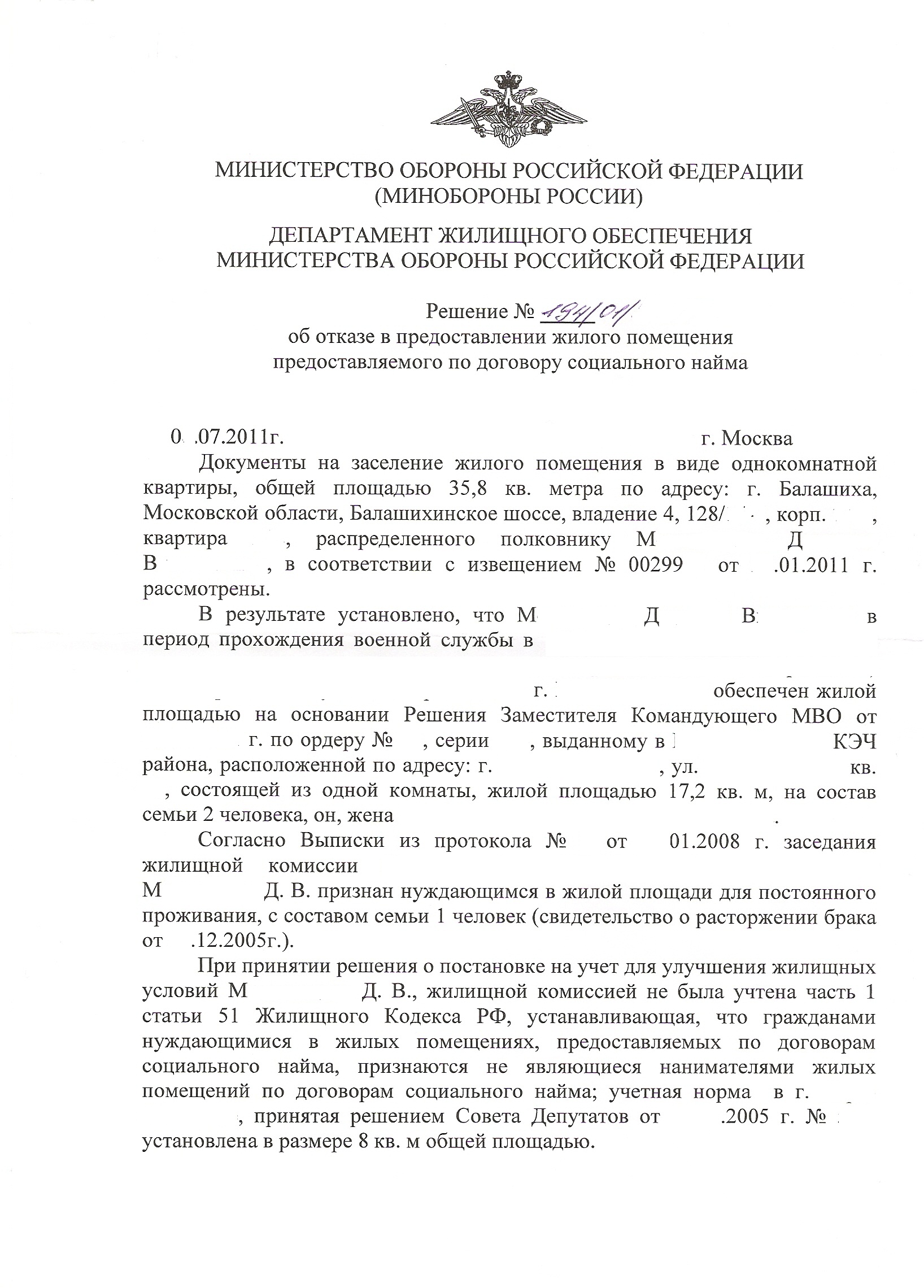 В принципе да.Написано то в решении об отказе красиво, как поначалу кажется. Только вот почему-то при принятии решения ДЖО закрыл глаза на то, что более 20 лет выслуги, ОШМ, право на дополнительную площадь, проживание с бывшими членами семьи в однокомнатной квартире.. Вложенное заявление на признание нуждающимся, надеюсь, прояснит "тонкости".