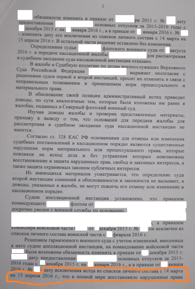 #1395Я вел дело этого военнослужащего. Такое решение вынесено с учетом того, что он уже как пол года обеспечен жильем. И они решили, что с него не убудет, а другим для примера.Определение судебной коллегии по делам военнослужащих Верховного Суда РФ от 11.10.2016 № 208-КГ16-37